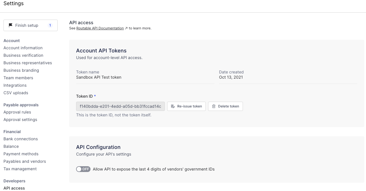 On the Routable Dashboard, you will see an API access section in your Account Settings (Sandbox).